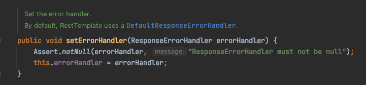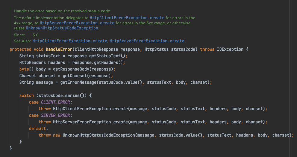 RestTemplate은 기본적으로 ResponseErrorHandler interface의 구현체인 DefaultResponseErrorHandler class를 사용하여 에러 처리를 하고 있습니다.