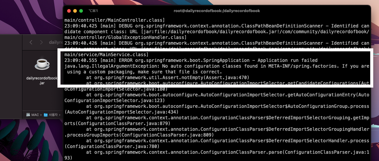 프로젝트를 배포하기 위해 위 방법으로 .jar 파일을 생성하고 실행하였으나 에러가 발생하였습니다.