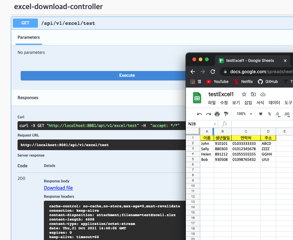 Swagger를 통해 해당 api를 테스트하면 Response body로 저렇게 바로 Download file을 통해 만들어진 엑셀 파일을 다운로드할 수 있습니다.