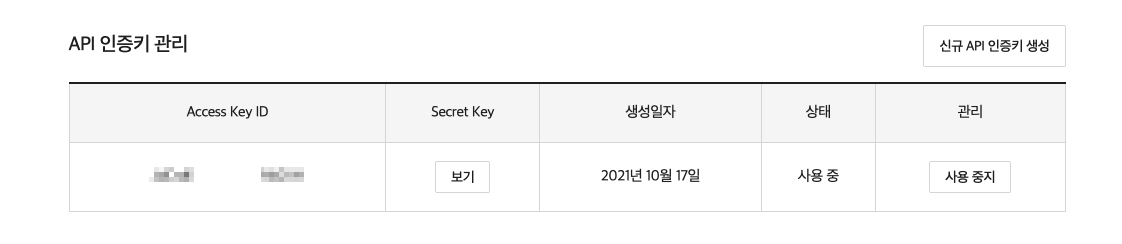 x-ncp-iam-access-key 값은 클라우드 플랫폼 -> 마이페이지 -> 계정 관리 -> 인증키 관리에서 'Access Key ID' 및 'Secret Key'를 확인할 수 있습니다. Secret Key는 아래 signature를 만드는데 사용됩니다.