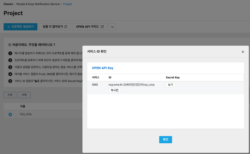 해당하는 serviceId는 위 과정에서 프로젝트 생성 후 서비스 ID 확인을 통해 ncp:sms:kr으로 시작되는 값을 확인할 수 있습니다.