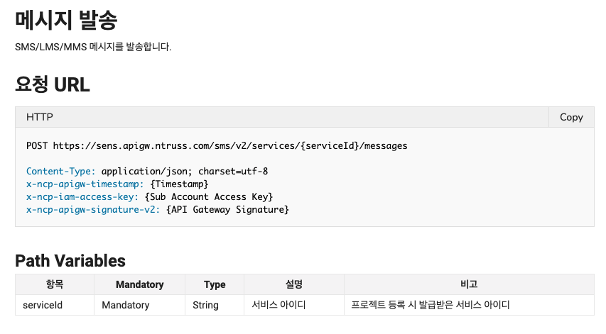 POST 형식으로 보내게 되고, https://sens.apigw.ntruss.com/sms/v2/services/{serviceId}/messages 에서 serviceId라는 Path Variable이 필요합니다.