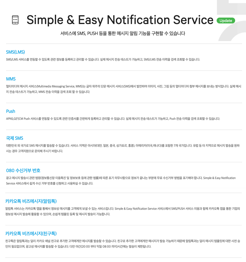 SMS, PUSH, 카카오 알림톡 등을 사용할 수 있는 서비스입니다. SMS의 경우 건당 9원, PUSH의 경우 건당 0.02원, 알림톡의 경우 건당 7.5원 등 비용이 발생합니다. (자세한 비용은 네이버 클라우드 플랫폼에서 확인 가능합니다.)