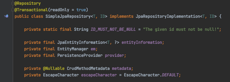 조금 더 자세하게 살펴보면 Spring Data JPA가 JPA를 추상화 했다는 말은 Spring Data JPA의 Repository를 구현하는 곳에서 JPA를 사용하고 있다는 뜻인데요. JpaRepository 인터페이스의 구현체인 SimpleJpaRepository를 보면 내부적으로 JPA의 EntityManager를 사용하는 것을 볼 수 있습니다.