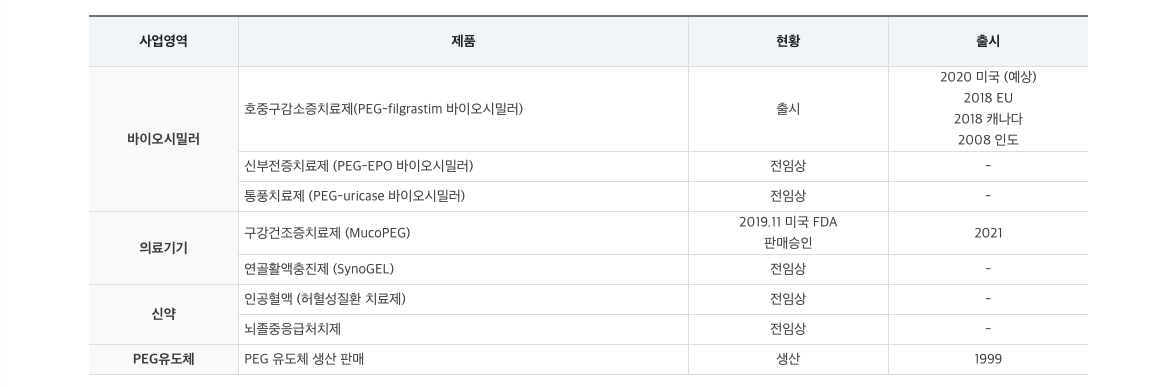 PEG 유도체 외에 이미 품목 허가에 성공한 제품들의 성장도 계속되고 있습니다. 호구 감소증 치료제 바이오시밀러 PEG-filgrastim은 캐나다와 유럽, 호주에서 품목 허가를 받아 판매 중이며, 미국 식품의약국(FDA) 승인 신청도 한 상태입니다.