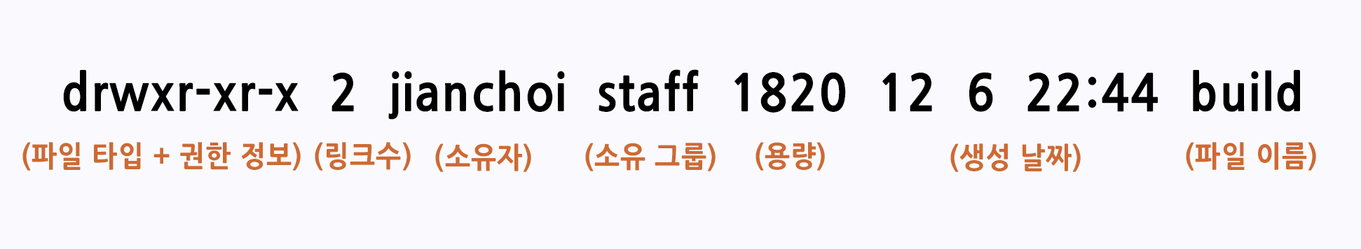 를 예로 들었을 때 맨 앞의 'd'는 파일의 타입인 디렉터리를 나타내고, 다음의 'rwx'는 파일 소유자의 권한, 다음 'r-x'는 파일 소유자의 그룹에 대한 권한, 마지막 'r-x'는 시스템의 다른 사용자에 대한 권한을 나타내는 것입니다.