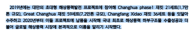 2019년 대만 해상풍력발전 프로젝트에 참여, 재킷을 납품하며 글로벌 해상풍력 시장에 이름을 알리기 시작했으며, 작년인 2022년 8월 HAI LONG 해상풍력단지와 관련하여 약 6천억 원 규모의 해상풍력 재킷 공급 계약을 체결하였는데요.