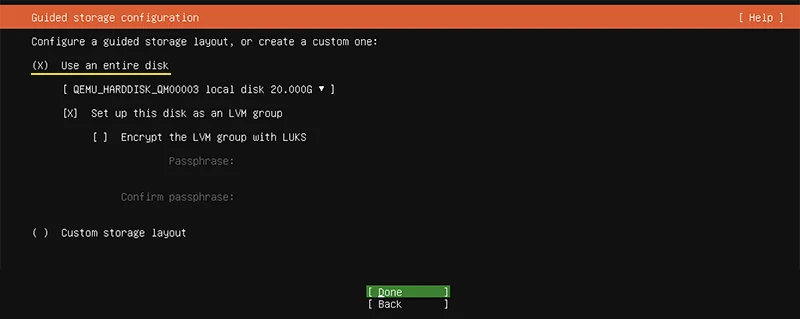 'Guided storage configuration'의 경우 storage layout을 따로 설정하지 않고 전체 디스크를 사용하도록 진행하였습니다.