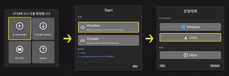 UTM을 실행하여 본격적으로 가상머신 환경에 Linux를 설치합니다.